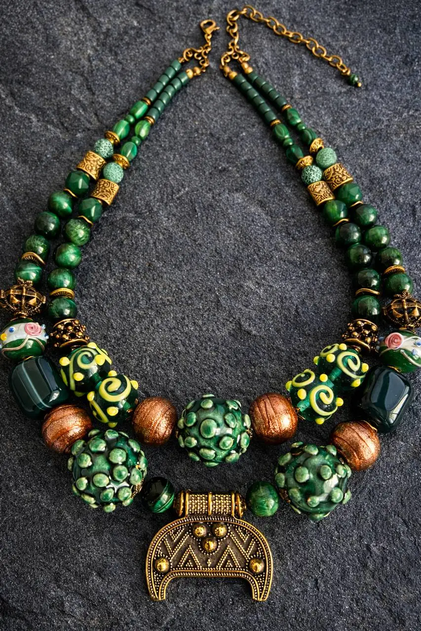 Авторська глазурована кераміка ручна ліпка, венеційка, агат, тигрове око тоноване, малахіт, хризоліт, латунь, підвіска авторська лунниця ручна робота.