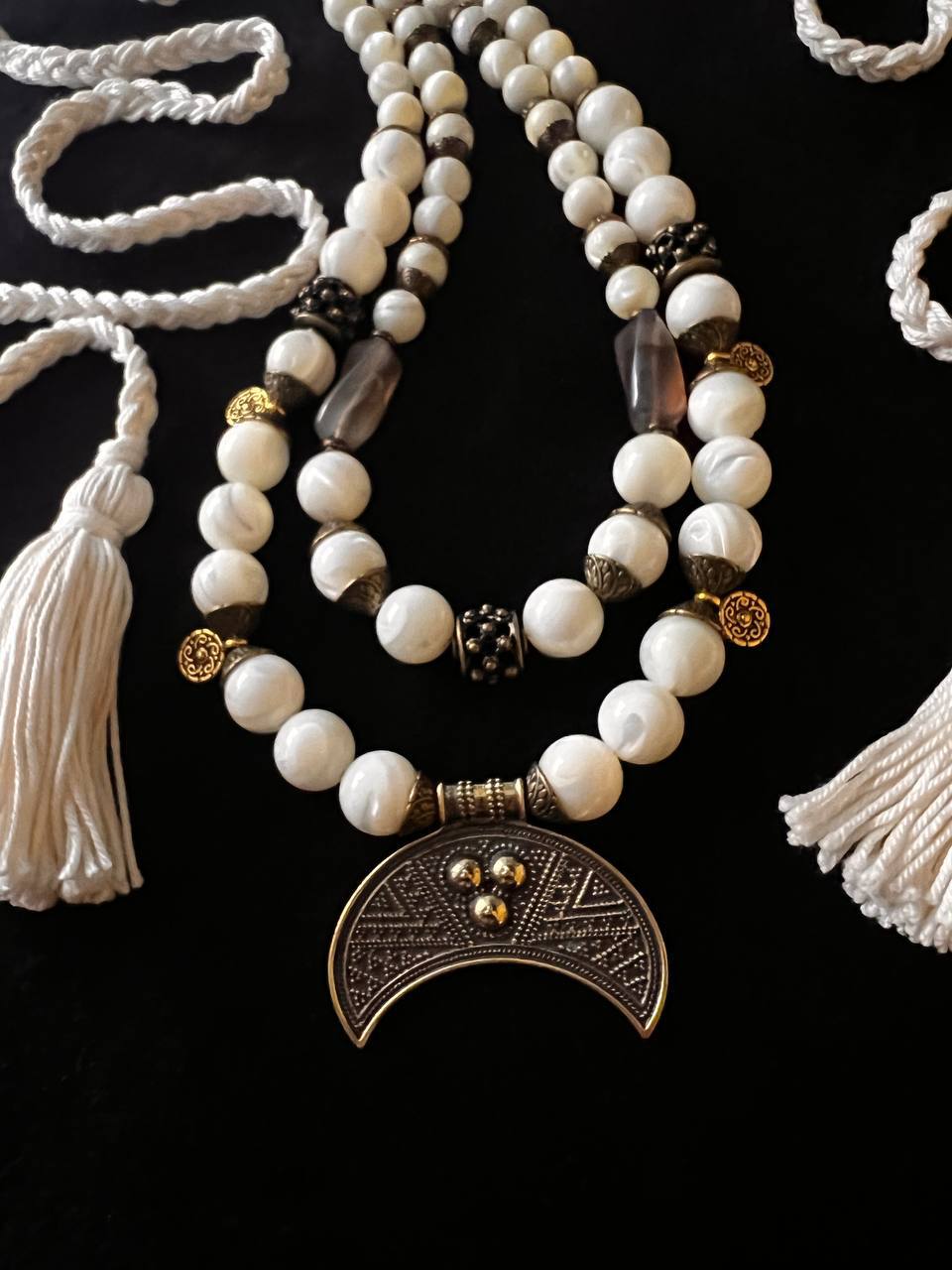 Лунниця литво латунь, перламутр(сучасні баламути), білий корал, фурнітура, агат,