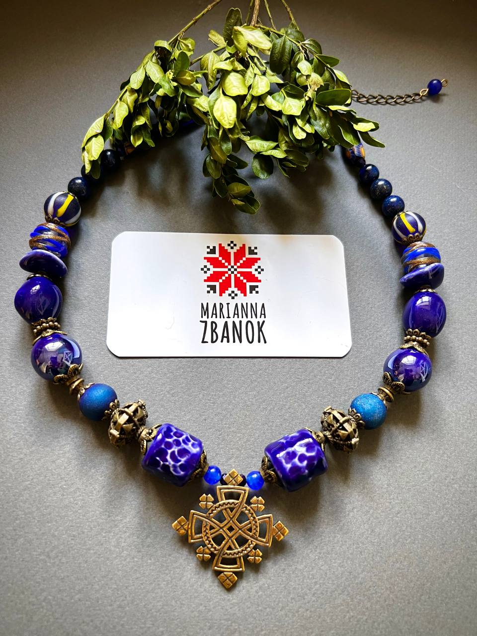 Виготовлена з кераміки ручної ліпки, намистин лампворк, агату, лазуриту, тибетських намистин, фурнітура латунь.